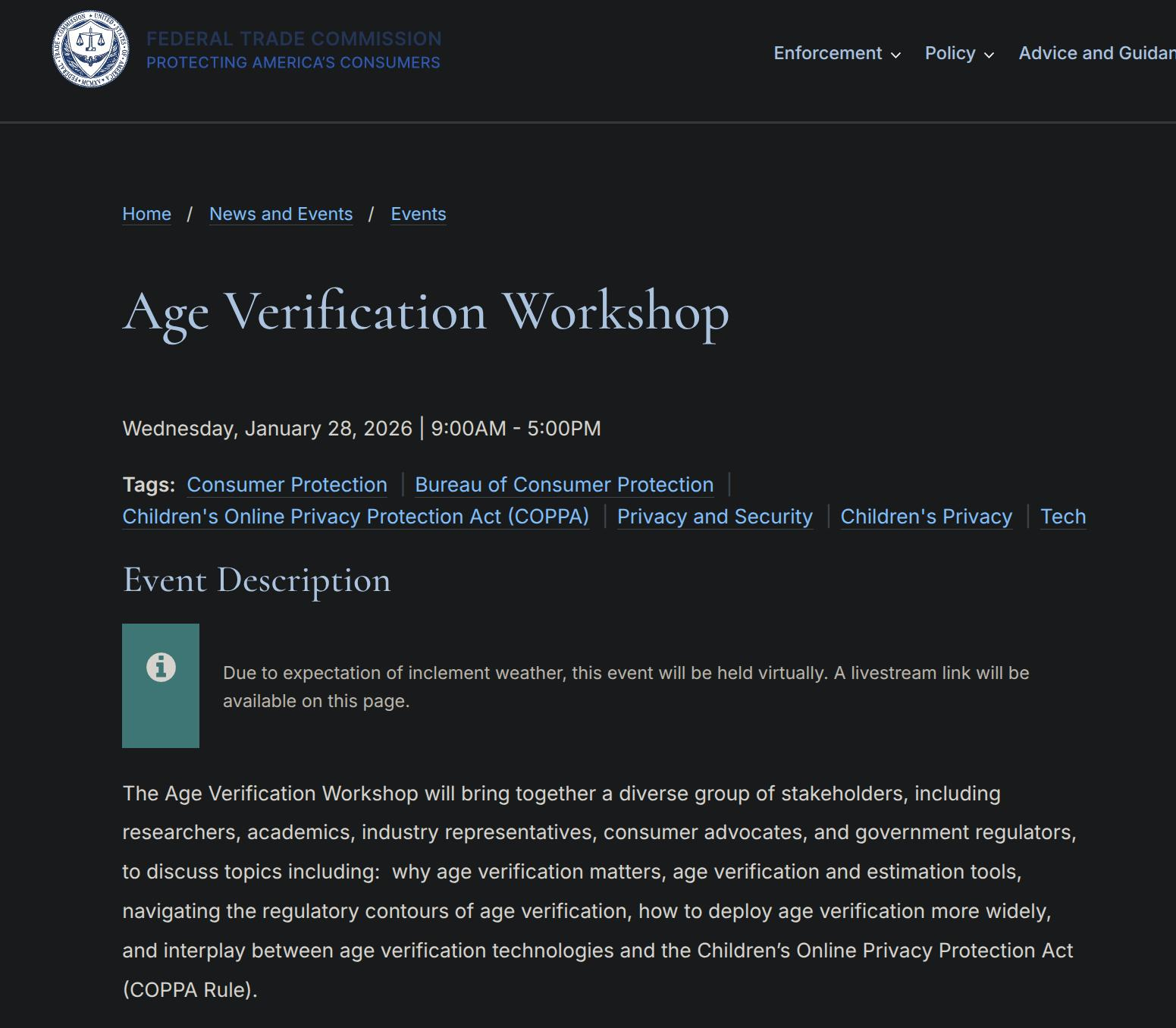 The Federal Trade Commission held a workshop on January 28, 2026 to discuss age verification technologies. Commissioner Mark Meador's pitch: "behavioral age verification" that detects a user's age "by the way they interact with an online platform" through machine learning pattern analysis. The sell point here involves avoiding intrusive government ID checks. The reality involves tracking everything you do online to build a behavioral profile that predicts how old you are.