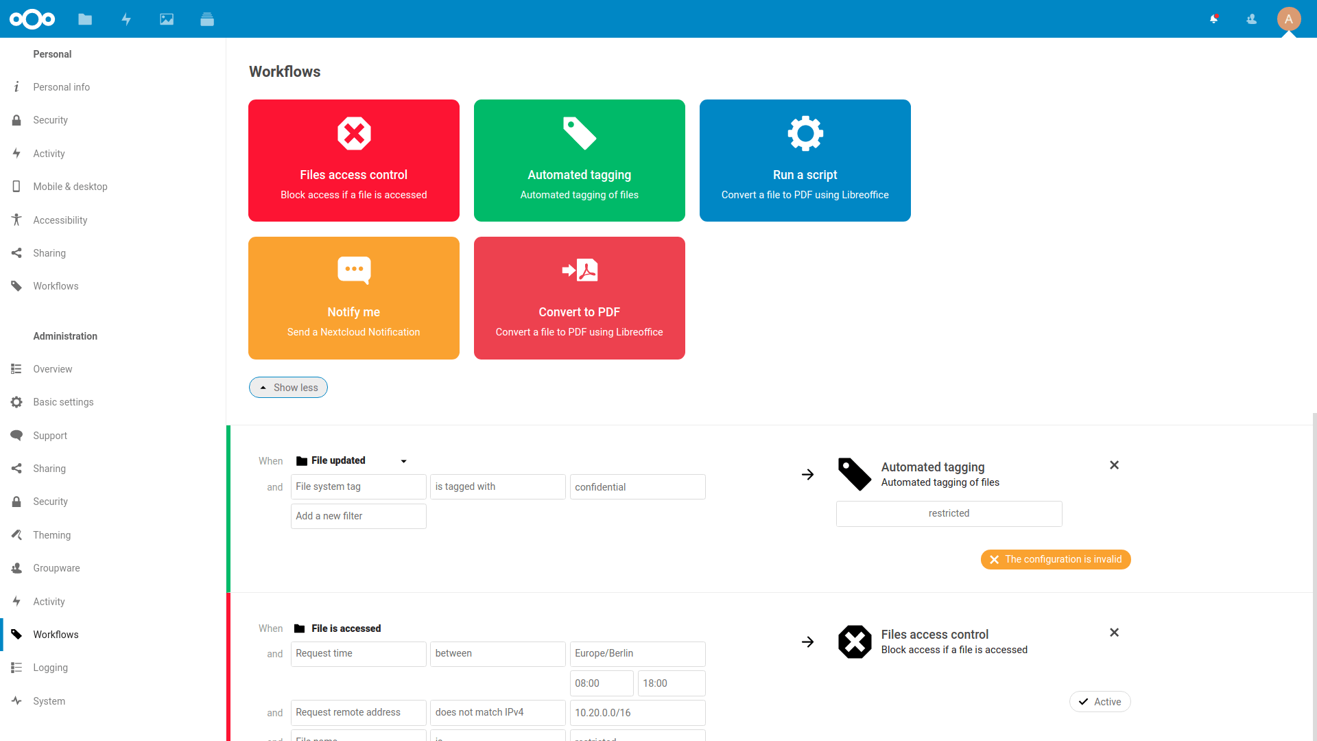 Nextcloud Flow brings enterprise-grade automation without enterprise complexity. Build workflows that process invoices, route documents for approval, or integrate with external services. No code required, just drag, drop, and configure.