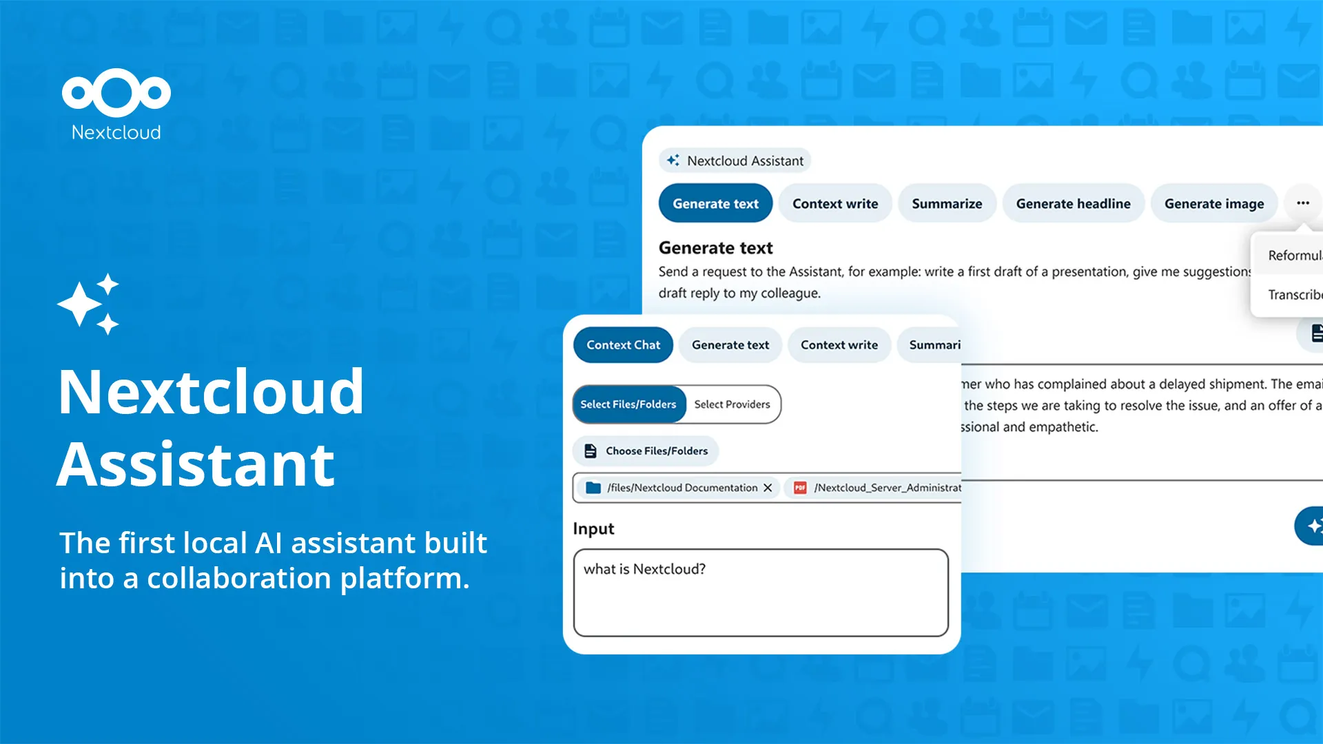 Nine years ago, Nextcloud emerged with a powerful mission: give people control over their data. Today, ITZBund operates Nextcloud for 300,000 employees across the German federal government. The French Ministry of Interior runs it for their 300,000 staff. Schleswig-Holstein deploys it across 25,000 systems. Swedish federal agencies, Dutch ministries, universities across Europe, hospitals, law firms, and millions of home users rely on Nextcloud for file storage, video conferencing, document collaboration, email, calendars, and now AI assistance. These organizations discovered they could have enterprise-grade collaboration tools while maintaining complete control over every byte of their data. No surveillance capitalism. No vendor lock-in. No data held hostage in Silicon Valley.