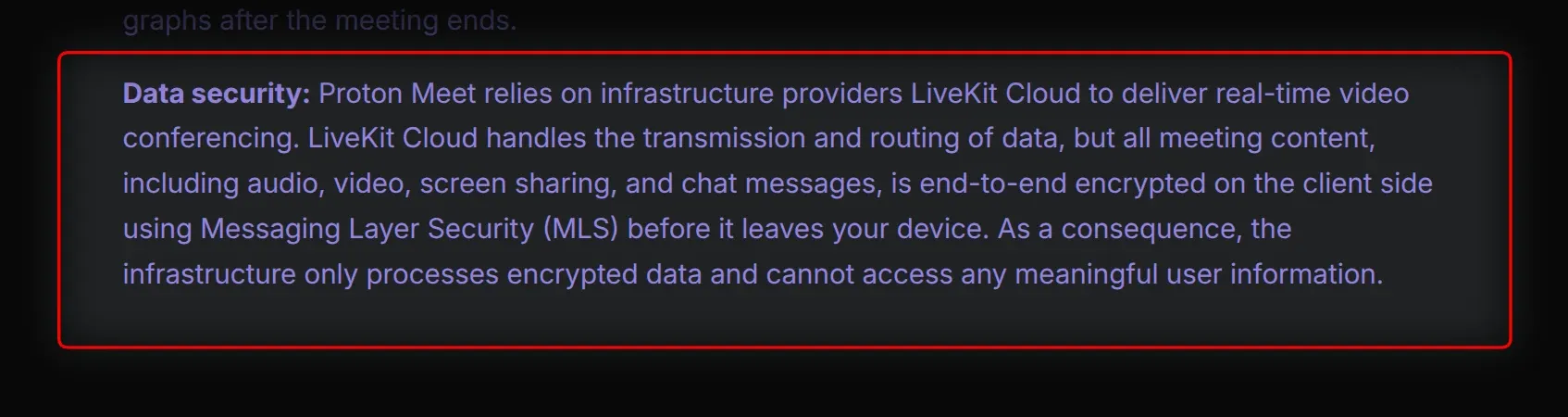 The disclosure is in Proton Meet's own privacy policy: "Proton Meet relies on infrastructure providers LiveKit Cloud to deliver real-time video conferencing. LiveKit Cloud handles the transmission and routing of data."