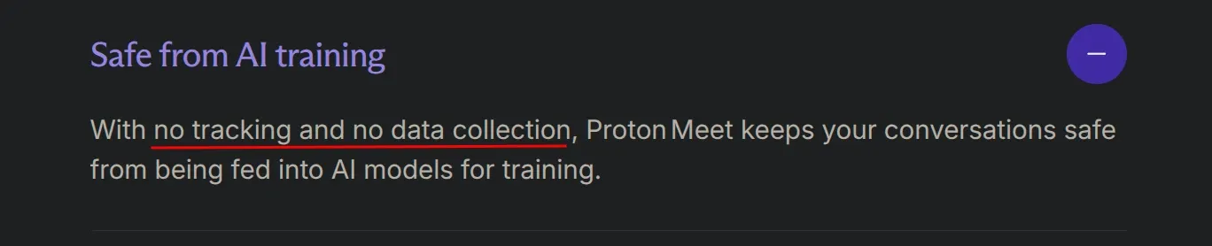 Proton's business-facing page also promises "No tracking and no data collection," which coexists with a 90-day tracking cookie set before login and LiveKit's legally-mandated call detail record retention.